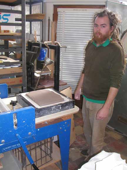 I do not have a close-up picture of the finished working mold. But in the next picture, you can see my friend, Aaron, who has just loaded a working mold with clay and is about to put it in the press. My press is an unusual device of my own design. I can put 12 tons on the mold. Because of that and the fact that I have cracked molds with only 4 tons of pressure, I now make heavy steel frames for my molds. That is the black you see about the edge of the mold. The tile press is that black square frame to Aaron's right. You can see the blue 12 ton bottle jack.