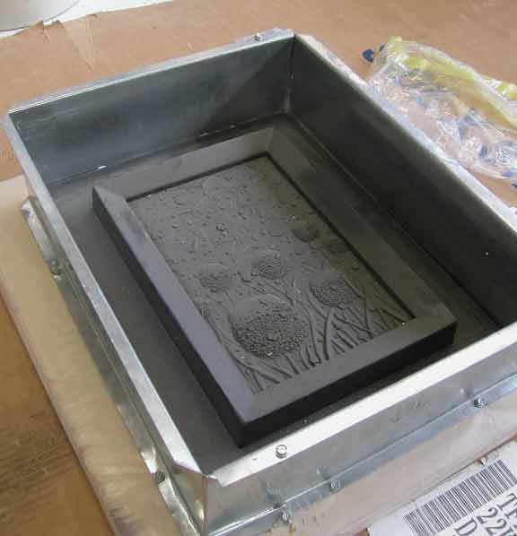 Above and below are a couple pics of making a mold for pressing out one of my 7" x 10" picture tiles with the ceramic frames. Above is the dusty black rubber master of my tile in the mold box. On top of the rubber goes a 1" x 3" steel channel frame a couple of layers of hardware cloth. Then I pour the plaster, let it sit for 24 hours...
